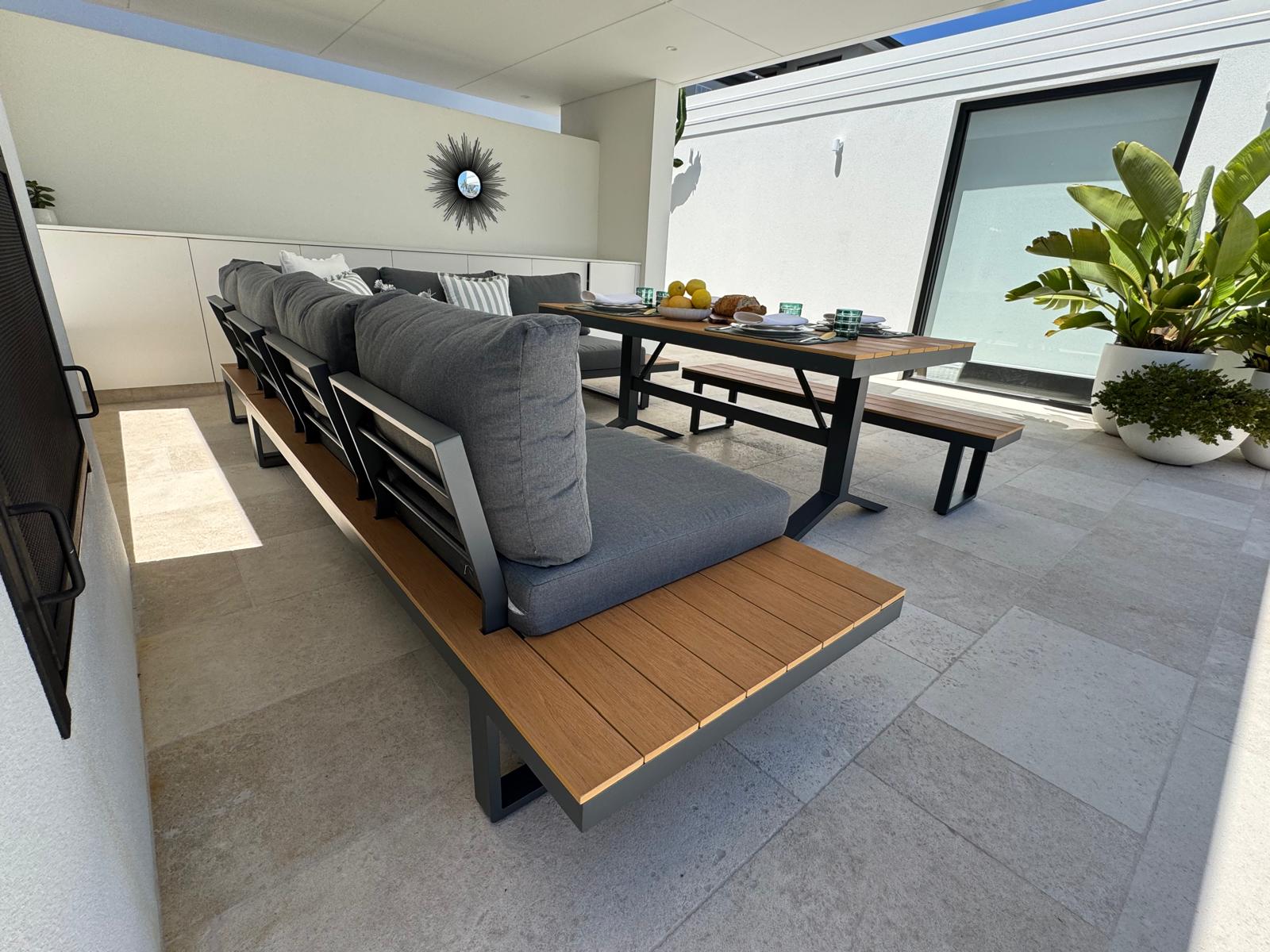 Elevate your outdoor dining and lounging with this modern aluminium and poly-wood set. Featuring a spacious corner lounge with plush grey cushions, a matching dining table, and a cushioned bench, it combines comfort and style for effortless entertaining. The sleek powder-coated frame and warm wood-look accents make it a timeless choice for any outdoor space.