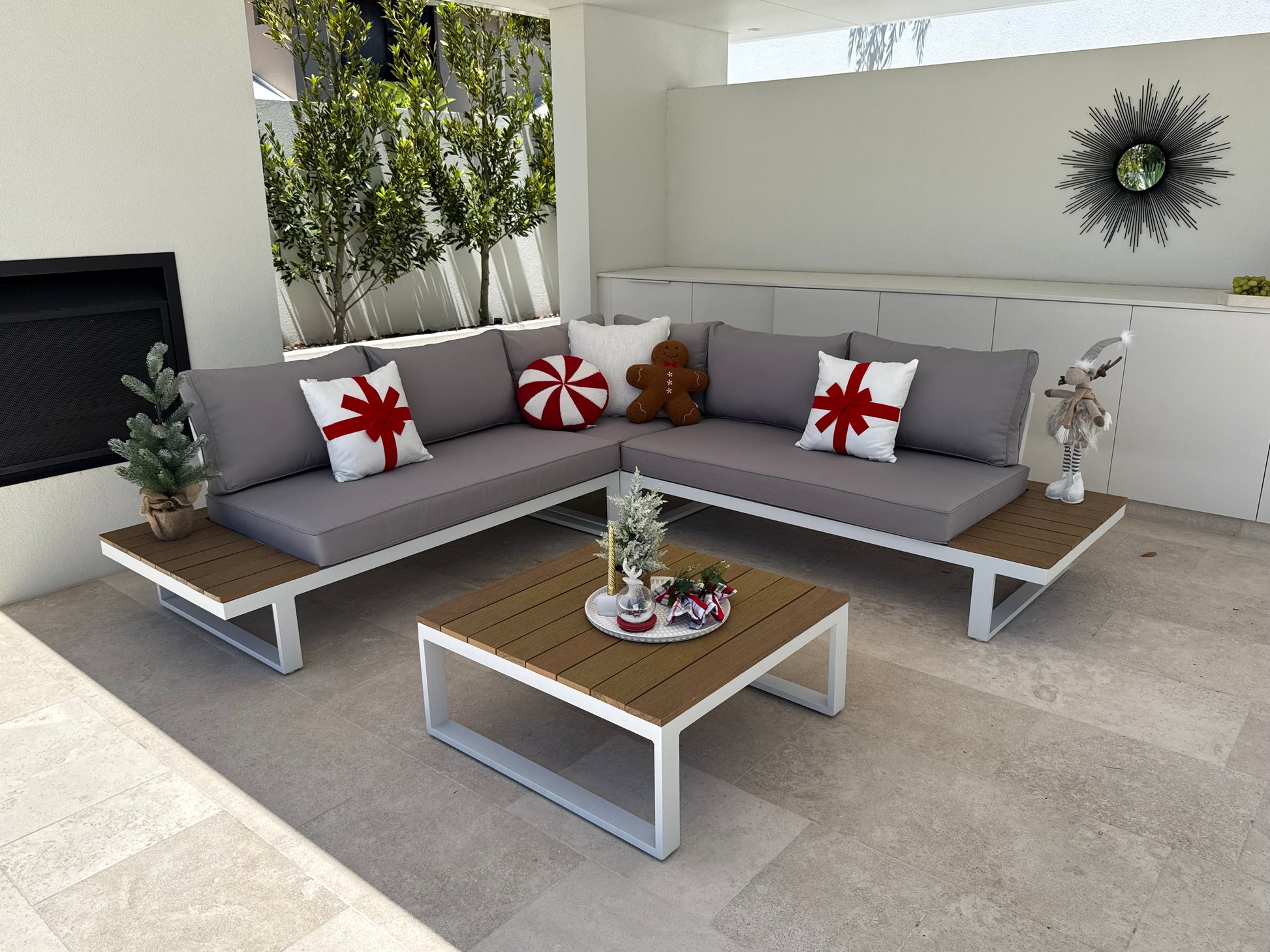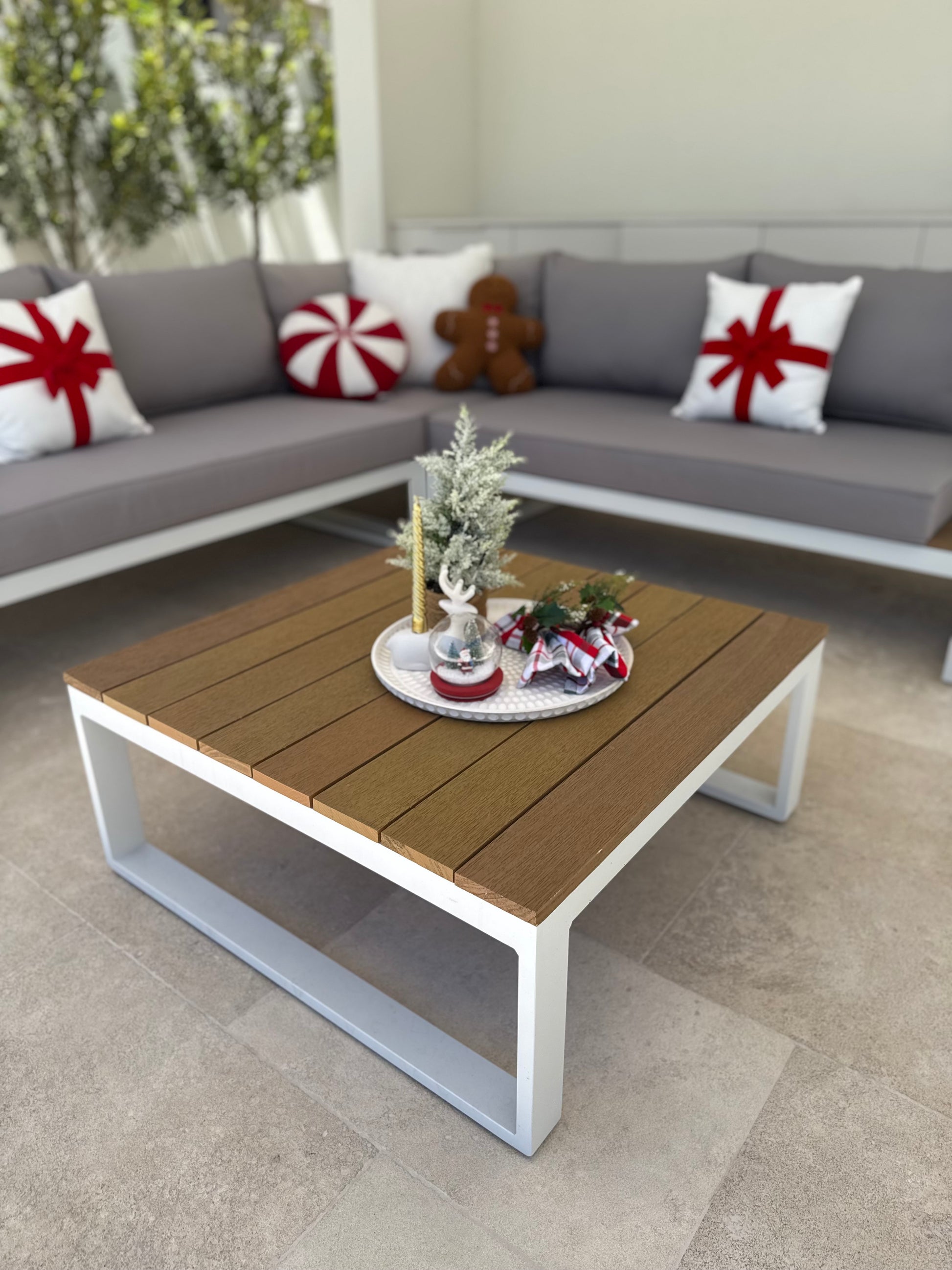 Transform your outdoor space with the Theodore 5-seater corner lounge — a perfect blend of modern design, comfort, and durability. Crafted with a powder-coated white aluminium frame and topped with sleek eucalyptus wood accents, this set brings a timeless, coastal elegance to any alfresco area.